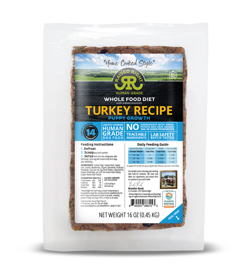 Raised Right Lightly Cooked Puppy Growth Turkey Frozen Dog Food