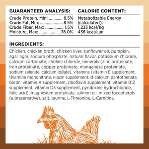 Chicken, chicken broth, chicken liver, pumpkin, sunflower oil (preserved with mixed tocopherols), agar agar, sodium phosphate, natural flavor, potassium chloride, calcium carbonate, choline chloride, magnesium sulfate, vitamins (vitamin E supplement, thiamine mononitrate, niacin supplement, d-calcium pantothenate, biotin, vitamin A supplement, riboflavin supplement, vitamin B12 supplement, vitamin D3 supplement, pyridoxine hydrochloride, folic acid), taurine, salmon oil (preserved with mixed tocopherols), minerals (zinc proteinate, iron proteinate, copper proteinate, manganese proteinate, sodium selenite, calcium iodate), salt, L-Threonine, L-Carnitine.