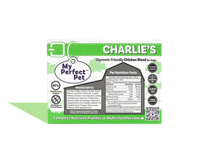 Charlie’s Glycemic Friendly Chicken Blend has only 1.1% carbohydrates and a calculated glycemic load of only 0.5 per ounce. This blend is made with boneless skinless chicken breast and thigh and blended with nutrient rich vegetables like broccoli and green beans. By eating the right diet, your dog will feel better, have more energy, and live longer. This blend is often recommended by veterinarians for dogs with diabetes, cancer, weight loss, or those that would otherwise benefit from a lower glycemic diet. Charlie's Chicken Blend is 100% complete and balanced so healthy adult dogs can enjoy it too!