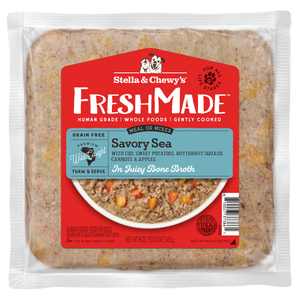 Stella & Chewy’s FreshMade is fresh food made easy! Human grade whole foods are gently cooked in their own juices for a craveable taste and tender texture. Reviewed by a board-certified veterinary nutritionist and made with only the good stuff – nutrient-rich meats & organ meats paired with healthy fruits, veggies, superfoods, botanicals & tasty bone broth - feeding a tasty, fresh meal is easier than ever! Simply thaw & serve as a complete meal or tasty topper and watch those tails wag!