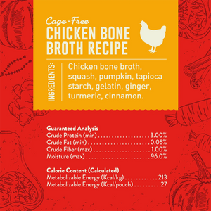 Our Bountiful Bone Broth is slowly simmered in small batches with real cage-free chicken making it rich in collagen and other valuable nutrients. With a convenient, reclosable pouch — it’s easy to add taste and health while you hydrate your dog’s favorite meal!