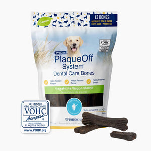 Dental Care Bones are the only chews on the market that contain the 100% natural and clinically proven A.N ProDen®. Dental Care Bones help oral problems with double action - ProDen PlaqueOff System® and the bone's unique shape helps to prevent new plaque and tartar from forming when used as directed, resulting in a fresher breath. They also contain omega 3 and 6 fatty acids and antioxidants that support immune health. The Veggie flavor is made out of a vegan recipe and is the perfect reward for your dog to relax with.