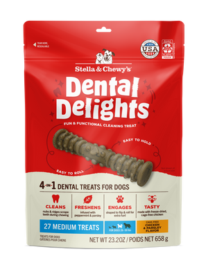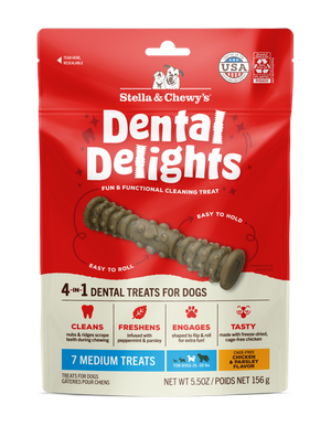 Stella & Chewy’s Dental DelightsTM put the ‘fun’ in cleaning your dog’s teeth! They are specially designed with ridges and nubs for flossing and scraping and include peppermint & parsley for fresh breath. Unlike other dental treats, they also roll for extra mental stimulation, AND with tasty freeze-dried, cage-free chicken, your pup will be begging for more teeth cleaning time!