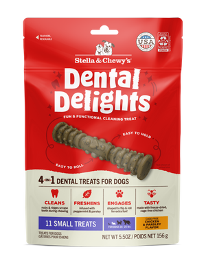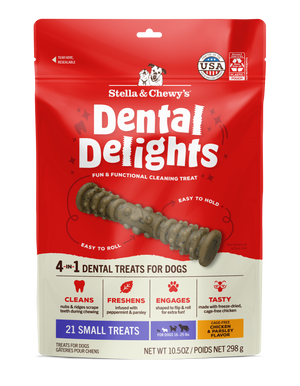 Stella & Chewy’s Dental DelightsTM put the ‘fun’ in cleaning your dog’s teeth! They are specially designed with ridges and nubs for flossing and scraping and include peppermint & parsley for fresh breath. Unlike other dental treats, they also roll for extra mental stimulation, AND with tasty freeze-dried, cage-free chicken, your pup will be begging for more teeth cleaning time!