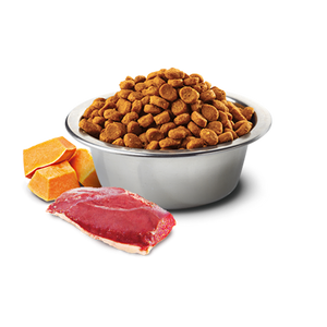 duck, dehydrated duck, sweet potatoes, chicken fat, dried pumpkin, dried whole eggs, herring, dehydrated herring, herring oil, pea fiber, dried carrot, suncured alfalfa meal, inulin, fructooligosaccharide, yeast extract, dried cantaloupe melon, dried apple, dried spinach, psyllium seed husk, dried sweet orange, dried blueberry, salt, brewers dried yeast, turmeric, glucosamine hydrochloride, chondroitin sulfate, vitamin A supplement, vitamin D3 supplement, vitamin E supplement, ascorbic acid, niacin, calcium pantothenate, riboflavin, pyridoxine hydrochloride, thiamine hydrochloride, biotin, folic acid, vitamin B12 supplement, choline chloride, beta-carotene, zinc methionine hydroxy analogue chelate, manganese methionine hydroxy analogue chelate, ferrous glycine, copper methionine hydroxy analogue chelate, selenium yeast, DL-Methionine, taurine, L-Carnitine, aloe vera gel concentrate, green tea extract, rosemary extract, mixed tocopherols (a preservative).