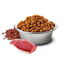 duck, dehydrated duck, sweet potatoes, dried beet pulp, dried whole eggs, quinoa seed, chicken fat, dehydrated herring, pea fiber, flaxseed, herring oil, dried broccoli, dried asparagus, fructooligosaccharide, yeast extract, brewers dried yeast, psyllium seed husk, calcium sulfate dihydrate, potassium chloride, salt, glucosamine hydrochloride, chondroitin sulfate, vitamin A supplement, vitamin D3 supplement, vitamin E supplement, ascorbic acid, niacin, pantothenic acid, riboflavin, pyridoxine hydrochloride, thiamine hydrochloride, biotin, folic acid, vitamin B12 supplement, choline chloride, beta-carotene, zinc methionine hydroxy analogue chelate, manganese methionine hydroxy analogue chelate, ferrous glycine, copper methionine hydroxy analogue chelate, selenium yeast, L-Lysine, DL-Methionine, taurine, L-Carnitine, green tea extract, powdered cellulose, mixed tocopherols (a preservative).