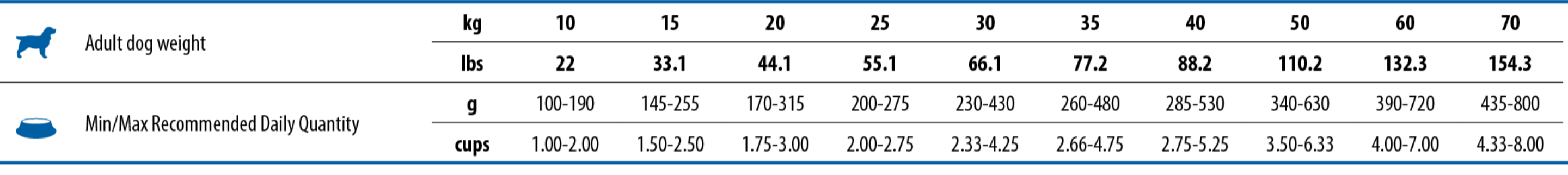 boneless chicken (20%), dehydrated chicken protein (20%), spelt (12%), oats (12%), chicken fat, dehydrated herring protein, dried beet pulp, fish oil (from herring), dried carrot, alfalfa meal, inulin, fructo-oligosaccharides, yeast extract (source of manno-oligo-saccharides), dried banana (0.5%), dried kiwi (0.5%), dried mango (0.5%), dried papaya (0.5%), dried pineapple (0.5%), dried spinach, psyllium husks and seeds, sodium chloride, dried brewers' yeast, turmeric, aloe vera extract, glucosamine, chondroitin sulphate.