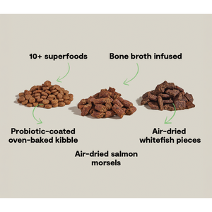 Level up your dog’s mealtime with our ultimate high protein superfood bowl which combines an epic blend of oven-baked salmon kibble coated in probiotics with gently air-dried, nutrient dense salmon morsels and whitefish pieces. This powerhouse formula delivers irresistible taste with a nutritional boost, packed with 10+ superfoods rich in antioxidants.