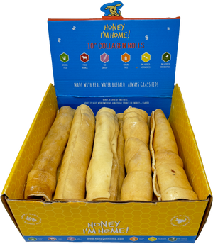 Our collagen rolls deliver a protein- rich chewing experience and are naturally rich in chondroitin and glucosamine, which support healthy joints and coat. Collagen is found below the top two layers of skin. It is higher in protein and less in fact than traditional rawhide treats as well as digests much easier.