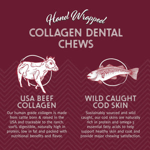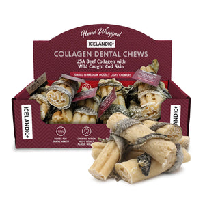 Icelandic+™ Beef Collagen Dental Chews with Cod Skin are an excellent rawhide alternative. Made with granulated collagen formed with deep ridges and a spiral wrap skin to reach back teeth and small spaces and help promote good dental health.