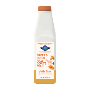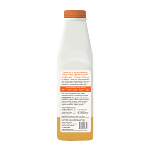 Raw goat's milk, organic pumpkin, organic carrot, organic golden beets, organic oranges, organic sweet potatoes, organic butternut squash, organic turmeric, organic ginger.