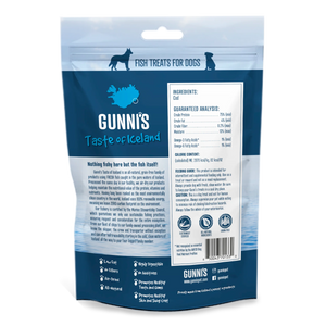 Our hand wrapped Cod Chewy Sticks are super tasty dog chews made from from 100% Cod fish skin. The Sticks have a rough texture and help to remove tartar from your dog's teeth. They are sourced in a sustainable manner from cold clear waters around Iceland and are air dried using 100% renewable energy in our family-owned facility. Treat your pup with our "Taste of Iceland" experience - they will love it !
