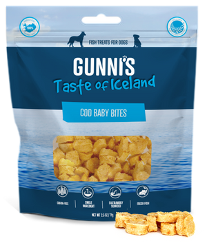 Our Cod Baby Bites are super tasty super premium dog treats made from single ingredient whole cod filets. Our Cod Baby Bites are protein packed! Indulge your dog with these delicious, crunchy treats or use them to train and reward your best friend.