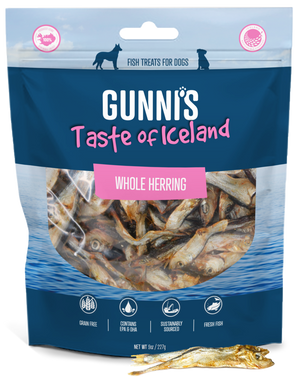 Our Whole Herring are super tasty, single ingredient dog treats. These treats are full of flavor and are an excellent source of omega-3 essential fatty acids. The herring is air dried using 100% renewable energy in our family-owned facility in Iceland. That's something to bark about!