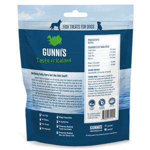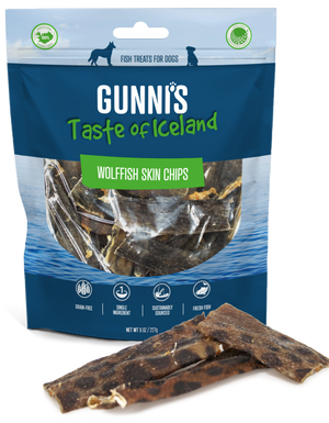 Our Wolffish Skin Chips are super tasty dog chews made from from 100% wolffish skin bites of all sizes. Each bag of chips is full of flavor that your dog will adore. Our Wolffish Skin Chips deliver a crunchy chewing experience dogs absolutely love! High digestibility and the chewing helps promote healthy teeth and gums.