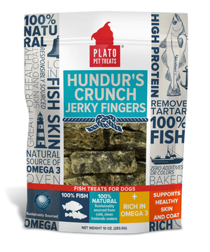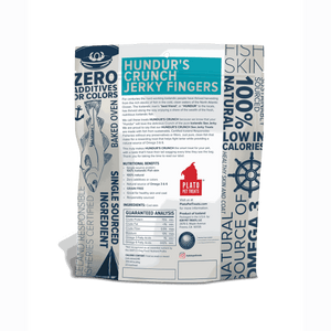 Hundur’s Crunch Jerky Fingers have only one ingredient: Cod Fish Skin. The cod are caught in the North Atlantic Ocean in a certified sustainable manner and then air-dried so as to retain the inherent nutrients in the fish while also naturally preserving them (but your dog will just think that they smell and taste amazing).