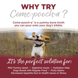 At the same time, it’s a delicious add-in to your dog’s bowl. Savory bone broth adds more of the meaty goodness that dogs crave, but with a touch of tang found in yogurt that adds interest.Looking for that special something to tempt your canine’s palate? Come-pooch-a is a perfect topper when you need a hand at dinnertime.