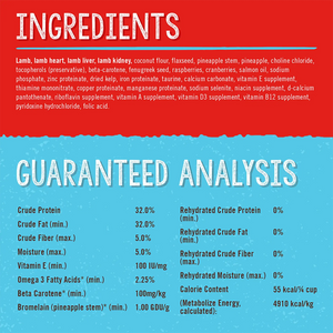 Lamb,beta-carotene,calcium carbonate,choline chloride,coconut flour,copper proteinate,cranberries,d-calcium pantothenate,dried kelp,fenugreek seed,flaxseed,folic acid.,iron proteinate,lamb heart,lamb kidney,lamb liver,manganese proteinate,niacin supplement,pineapple,pineapple stem,pyridoxine hydrochloride,raspberries,riboflavin supplement,salmon oil,sodium phosphate,sodium selenite,taurine,thiamine mononitrate,tocopherols (preservative),vitamin A supplement,vitamin B12 supplement,vitamin D3 supplement,vitamin E supplement,zinc proteinate