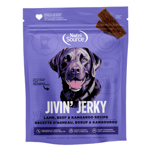 NutriSource Lamb, Beef & Kangaroo Jivin’ Jerky is made with high-quality protein.