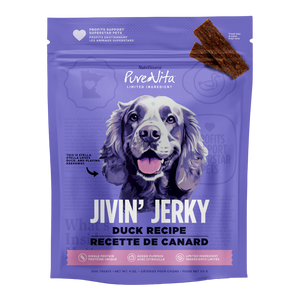 NutriSource PureVita Duck Jivin’ Jerky is made with high-quality protein.
