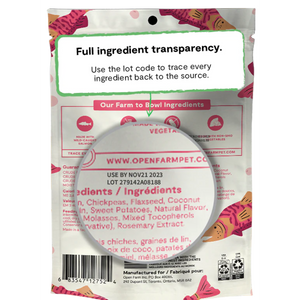 Because of their ingredient sourcing, transparency, and testing, Open Farm has a wide variety of healthy, trustworthy products that we love. Open Farm uses 100% animal welfare certified meats from grass-fed, pasture raised animals, with no growth hormones or antibiotics, ever. They use 100% Wild-caught, sustainably sourced fish as well as Non-GMO fruits and vegetables. If farming or fishery partners can’t pass regular audits to ensure optimal practices, Open Farm does not work with them. Learn more about Open Farm's sourcing practices here.