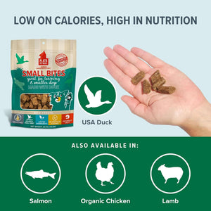 Big things come in Plato Small Bites Duck Dog Treats! Your pooch will pounce on these bite-sized meaty morsels, which are made with real duck as the main ingredient. These grain-free treats are naturally preserved, help support healthy digestion and contain no artificial flavors, corn, wheat or soy. They’re air-dried in batches to help lock in more nutrients and provide a better taste – making them a paw-some way to reward your four-legged best friend!