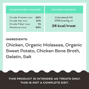 Chicken, Organic Molasses, Organic Sweet Potato, Chicken Bone Broth, Gelatin, Salt