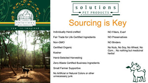 Taking it much further than organic, the ingredients in Solutions Pet Products are sourced from regenerative farms, where animals happily roam throughout pastures, eating their natural diet that was grown on microbe-rich, healthy soil that has never been treated with pesticides. This matters because relative to conventional farming, regenerative farming produces crops and livestock with higher levels of phytochemicals, vitamins, and minerals. Regenerative farming systems can enhance dietary levels of compounds known to reduce risk of various chronic diseases.