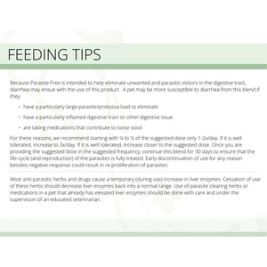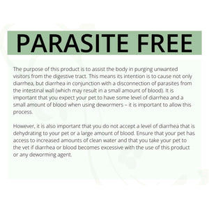 Cautions: Diarrhea is the body’s natural mechanism for purging unwanted visitors. Severe diarrhea will cause dehydration. Mild diarrhea with use of this product is acceptable if your pet is drinking well. If animals’ condition worsens or does not improve, discontinue use, and consult your veterinarian. Not for use during pregnancy.