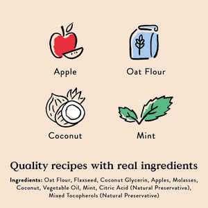 Oat Flour, Flaxseed, Coconut Glycerin, Apples, Molasses, Coconut, Vegetable Oil, Mint, Citric Acid (Natural Preservative), Mixed Tocopherols (Natural Preservative)