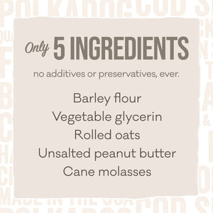 Barley Flour, Vegetable Glycerin, Rolled Oats, Unsalted Peanut Butter, Cane Molasses.