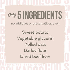 Sweet Potato, Vegetable Glycerin, Rolled Oats, Barley Flour, Dried Beef Liver