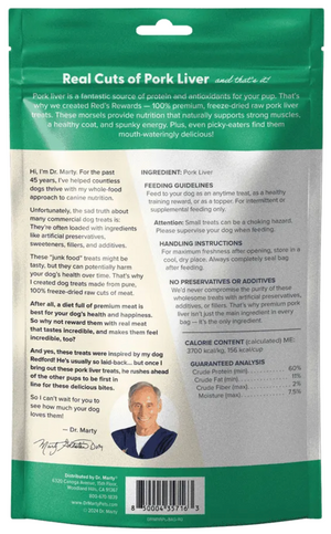 That’s why we selected pork liver as the single ingredient in Red’s Rewards. This incredible protein is naturally full of protein and vital minerals to fuel your dog’s youthful energy, nourish their coat, and support their healthy muscles.