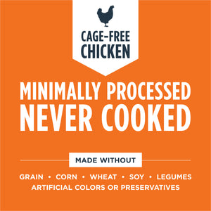 Chicken (including Ground Chicken Bone), Chicken Liver, Chicken Heart, Pumpkinseeds, Ground Flaxseed, Montmorillonite Clay, Salmon Oil, Carrots, Apples, Butternut Squash, Vitamins (Vitamin E Supplement, Thiamine Mononitrate, Vitamin D3 Supplement), Potassium Chloride, Tricalcium Phosphate, Choline Chloride, Taurine, Yeast Culture, Salt, Minerals (Zinc Proteinate, Copper Proteinate, Manganese Proteinate, Calcium Iodate), DL-Methionine, Mixed Tocopherols (for freshness), Blueberries, Spinach, Rosemary Extract.
