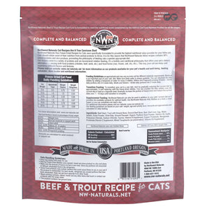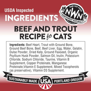 Beef Heart, Trout with Ground Bone, Ground Beef Bone, Beef, Beef Liver, Egg, Water, Gelatin, Dulse Powder, Dried Kelp, Ground Flaxseed, Organic Psyllium Husk Powder, Salmon Oil, Inulin, Potassium Chloride, Sodium Chloride, Taurine, Vitamin B Supplement, Copper Proteinate, Manganese Proteinate,Vitamin E Supplement, Mixed Tocopherols (as preservative), Vitamin D3 Supplement.