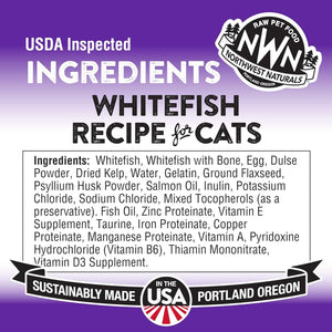 Northwest Naturals Whitefish Cat Food is formulated to meet the nutritional levels established by the AAFCO Cat Food Nutrient Profiles for all life stages.