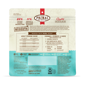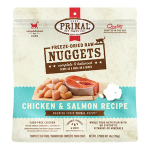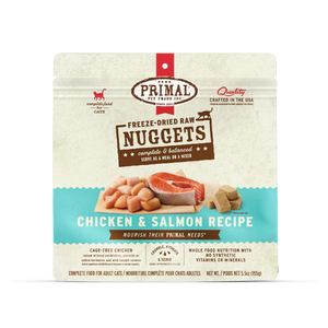 Primal Chicken & Salmon Formula Nuggets Grain-Free Raw Freeze-Dried Cat Food offers your hungry kitty all the benefits of a safe and wholesome raw-food diet—without you having to grind, chop, measure or mix the ingredients yourself! Taking great pride to source only the best ingredients, this tasty and nutritious diet is packed with naturally derived vitamins and minerals. The high-protein ratio appeals to your feline friend’s primal diet, and it’s an excellent way to maintain a proper weight and boost overall health. And best of all, it’s a breeze to serve, thanks to the naturally preserved nuggets—just add water! The proof comes in watching him lick the bowl clean while thriving happily and healthfully.