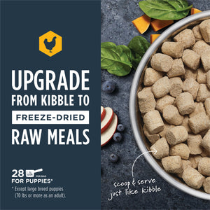 Upgrade your puppy's bowl from kibble to freeze-dried raw. Instinct Raw Freeze-Dried Meals for Puppies is protein packed with cage-free chicken and organs and non-GMO vegetables, fruits + vitamins & minerals. Made without grain, corn, wheat, soy, legumes, artificial colors or preservatives.