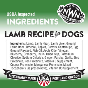 Lamb, Lamb Heart, Lamb Liver, Ground Lamb Bone, Broccoli, Apples, Carrots, Cantaloupe, Egg, Ground Flaxseed, Fish Oil*, Apple Cider Vinegar, Blueberry, Cranberry, Inulin, Dried Kelp, Potassium Chloride, Sodium Chloride, Ginger, Parsley, Garlic, Zinc Proteinate, Iron Proteinate, Vitamin E Supplement, Copper Proteinate, Manganese Proteinate, Mixed Tocopherols (as preservative), Vitamin D Supplement.