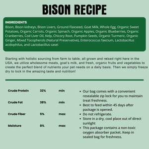Bison, Bison Kidneys, Bison Livers, Whole Egg, Flaxseed, Organic Sweet Potato, Kelp, Organic Carrots, Organic Apples, Organic Blueberries, Cod Liver Oil, Pumpkin Seeds, Organic Spinach, Turmeric, Chicory Root, Organic Cranberries, Ginger, Mixed Tocopherols, Inulin, Dried Enterococcus Faecium Fermentation Product, Dried Lactobacillus Acidophilus Fermentation Product.