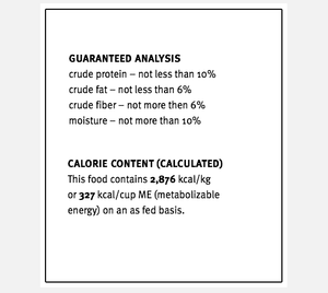 This food contains 2,876 kcal/kg or 327 kcal/cup ME (metabolizable energy) on an as fed basis.