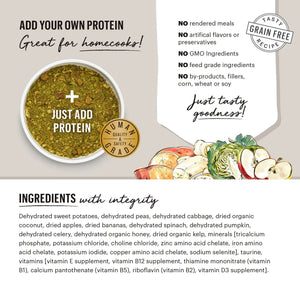 Dehydrated sweet potatoes, dehydrated peas, dehydrated cabbage, dried organic coconut, dried apples, dried bananas, dehydrated spinach, dehydrated pumpkin, dehydrated celery, dehydrated organic honey, dried organic kelp, minerals [tricalcium phosphate, potassium chloride, choline chloride, zinc amino acid chelate, iron amino acid chelate, potassium iodide, copper amino acid chelate, sodium selenite], taurine, vitamins [vitamin E supplement, vitamin B12 supplement, thiamine mononitrate (vitamin B1), calcium pantothenate (vitamin B5), riboflavin (vitamin B2), vitamin D3 supplement].