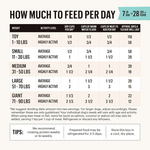This meal rehydrates to 4x its weight—just add warm water and your pet’s favorite meat or fish for the paw-fect meal! A 10 lb. box makes 40 lbs. of fresh food.