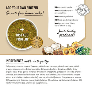 Dehydrated carrots, flaxseed, dehydrated parsnips, dehydrated peas, dried organic coconut, dehydrated pumpkin, dehydrated celery, dehydrated kale, dried organic kelp, dried garlic, minerals [tricalcium phosphate, potassium chloride, choline chloride, zinc amino acid chelate, iron amino acid chelate, potassium iodide, copper amino acid chelate, sodium selenite], taurine, vitamins [vitamin E supplement, vitamin B12 supplement, thiamine mononitrate (vitamin B1), calcium pantothenate (vitamin B5), riboflavin (vitamin B2), vitamin D3 supplement].