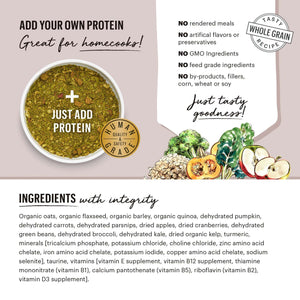 Dabbled in home cooking, but don't love the prep work? This Whole Grain Veggie & Fruit Dog Food Base Mix wholesome mix of all-natural, whole food ingredients that eliminates the prep work associated with home cooking. Simply add warm water, your own source of protein and voila! A homemade meal that you and your pets will love. It's a winner for raw feeders and homecookers who want to be sure their dog is getting all of their essential nutrients, and a great choice for adult and senior dogs dealing with meat sensitivities. It’s also 100% human grade, meaning we use the same whole foods you’d recognize in your own kitchen, and make this recipe in a human food facility for the highest quality and safety standards.