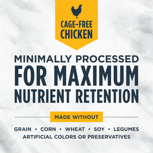 Chicken (including Ground Chicken Bone), Chicken Liver, Chicken Heart, Montmorillonite Clay, Ground Flaxseed, Salmon Oil, Carrots, Apples, Butternut Squash, Vitamins (Vitamin E Supplement, Thiamine Mononitrate, Vitamin D3 Supplement), Potassium Chloride, Tricalcium Phosphate, Choline Chloride, Taurine, Yeast Culture, Salt, Minerals (Zinc Proteinate, Copper Proteinate, Manganese Proteinate, Calcium Iodate), DL-Methionine, Blueberries, Spinach.