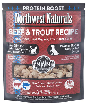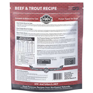 Beef Heart, Trout, Beef Bone, Beef, Beef Liver, Egg, Water, Gelatin, Dulse Powder, Dried Kelp, Ground Flaxseed, Organic Psyllium Husk Powder, Salmon Oil, Inulin, Potassium Chloride, Sodium Chloride, Taurine, Vitamin B Supplement, Copper Proteinate, Manganese Proteinate, Vitamin E Supplement, Copper Proteinate, Mixed Tocopherols (as preservative), Vitamin D3 Supplement