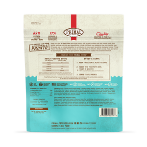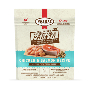 This nourishing, biologically appropriate raw cat food thaws in minutes and comes in a convenient, bite-sized, easy-to-portion format. Primal’s Chicken & Salmon Recipe Frozen Raw Scoopable Pronto features cage-free chicken raised without antibiotics, steroids, or added hormones, wild-caught salmon, and other real, whole foods that deliver optimal nutrition and digestibility. Just scoop and serve to keep your cat in their prime. Available in 1-pound resealable bags.