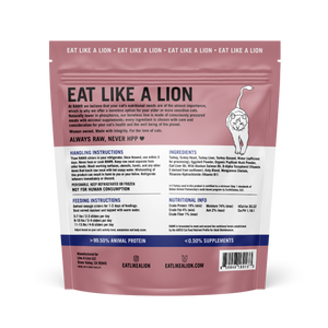 Turkey, Turkey Heart, Turkey Liver, Turkey Gizzard, Water (sufficient for processing), Eggshell Powder, Organic Psyllium Husk Powder, Cod Liver Oil, Wild Alaskan Salmon Oil, D-Alpha Tocopherol (Vitamin E derived from sunflower), Kelp Blend, Manganese Chelate, Thiamine Hydrochloride (Vitamin B1)