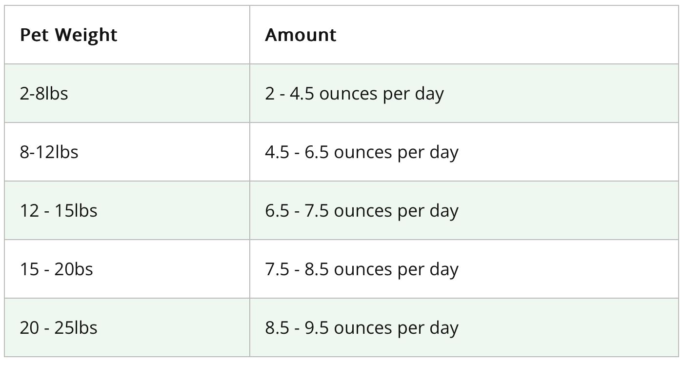 It is our recommendation that you calculate daily intake to account for the increased bioavailability and absorption. Use our feeding calculator to calculate caloric intake at 64kcals/oz.This is better for your budget and generally better for your pet’s health and body composition.